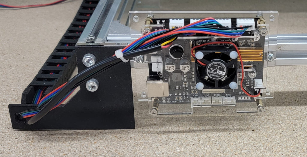 No interference with existing brackets or drag chain kits - board is slightly larger than the 8-Bit board in width. Note that the 32-Bit board also now includes a cooling fan for the stepper drivers - another improvement to increase longevity.