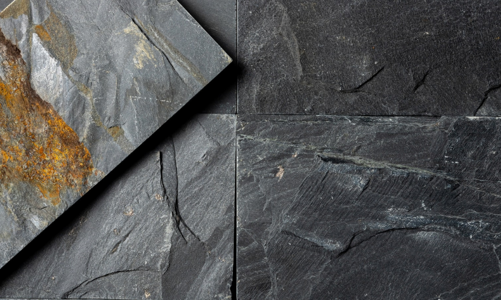 Slate is a fine-grained, clayey metamorphic rock that splits, into thin slabs that have great tensile strength and durability. Slate can appear as black, blue, purple, red, green, or grey. Dark slates usually owe their colour to carbonaceous material or finely divided iron sulphide. Reddish and purple varieties owe their colour to the presence of hematite (iron oxide), and green varieties owe theirs to the presence of chlorite, a green micaceous clay mineral.