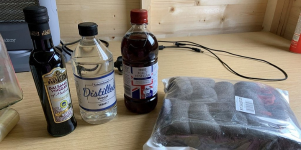 I wanted to try a couple of options on wood first, just to get an idea of the effect I could get, so I got some birch ply, some wood slices and some pine strips. I’d also seen that using tea or coffee would also affect colouration, so I gathered some supplies including different types of vinegar.